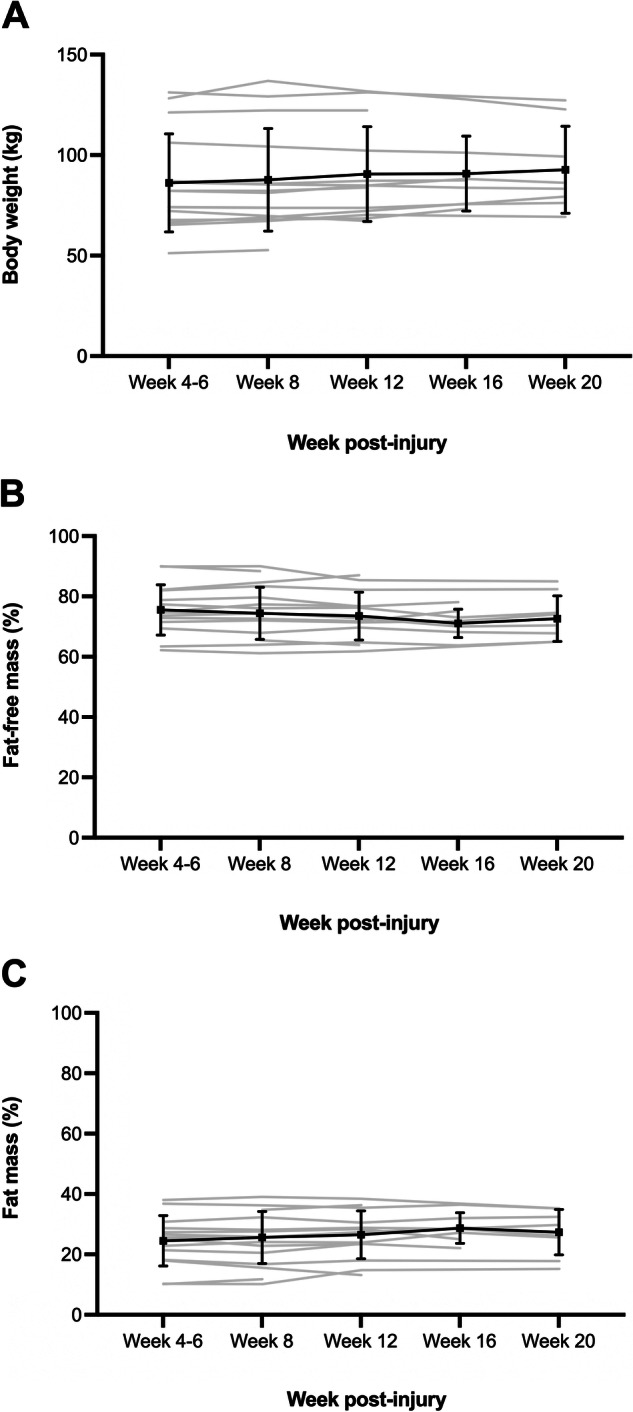 Conclusion: During SCI rehabilitation, mean REE, weight, and body composition remain unchanged, and FFM-based BMR prediction equations may be an acceptable alternative to indirect calorimetry. Future research designs should avoid single indirect calorimetry measures as snapshot data may not represent typical REE in this population.