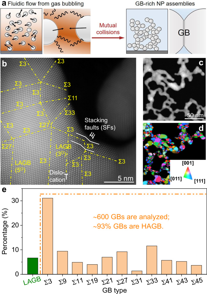 Grain boundaries in noble metal catalysts have been identified as critical sites for enhancing catalytic activity in electrochemical reactions such as the oxygen reduction reaction. However, conventional methods to modify grain boundary density often alter particle size, shape, and morphology, obscuring the specific role of grain boundaries in catalytic performance. This study addresses these challenges by employing gold nanoparticle assemblies to control grain boundary density through the manipulation of nanoparticle collision frequency during synthesis. We demonstrate a direct correlation between increased grain boundary density and enhanced two-electron oxygen reduction reaction activity, achieving a significant improvement in both specific and mass activity. Additionally, the gold nanoparticle assemblies with high grain boundary density exhibit remarkable electrochemical stability, attributed to boron segregation at the grain boundaries, which prevents structural degradation. This work provides a promising strategy for optimizing the activity, selectivity, and stability of noble metal catalysts through precise grain boundary engineering.