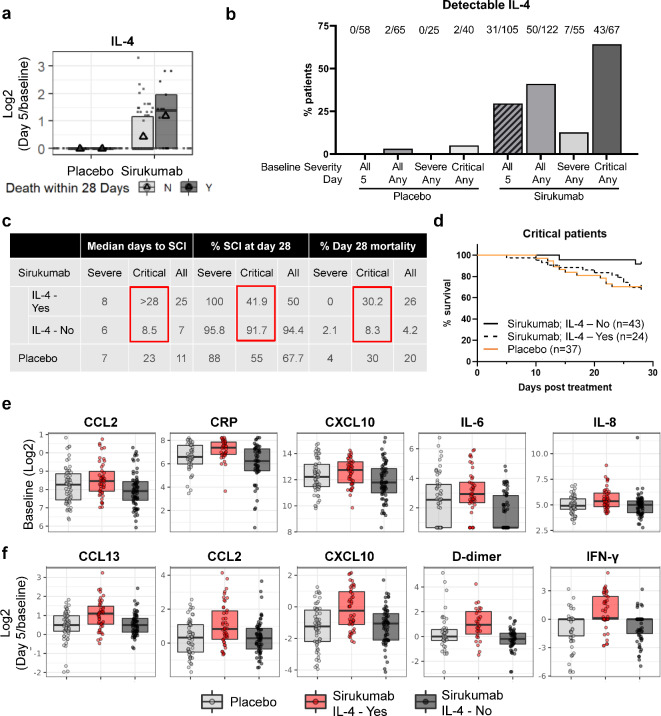 We examined candidate biomarkers for efficacy outcomes in hospitalized COVID-19 patients who were treated with sirukumab, an IL-6 neutralizing antibody, in a randomized, double-blind, placebo-controlled, phase 2 trial. Between May 2020 and March 2021, 209 patients were randomized (sirukumab, n = 139; placebo, n = 70); 112 had critical COVID-19. Serum biomarkers were evaluated for the pharmacodynamic effect of sirukumab and for their potential prognostic and predictive effect on time to sustained clinical improvement up to Day 28, clinical improvement at Day 28, and mortality at Day 28. The absence of detectable IL-4 increase and smaller increases in CCL13 post-baseline were most significantly associated with better response to sirukumab (versus placebo) treatment for all clinical efficacy outcomes tested, especially in patients with critical COVID-19. These data suggest that patients with critical COVID-19 without detectable sirukumab-induced IL-4 levels are more likely to benefit from sirukumab treatment. ClinicalTrials.gov Identifier: NCT04380961.
