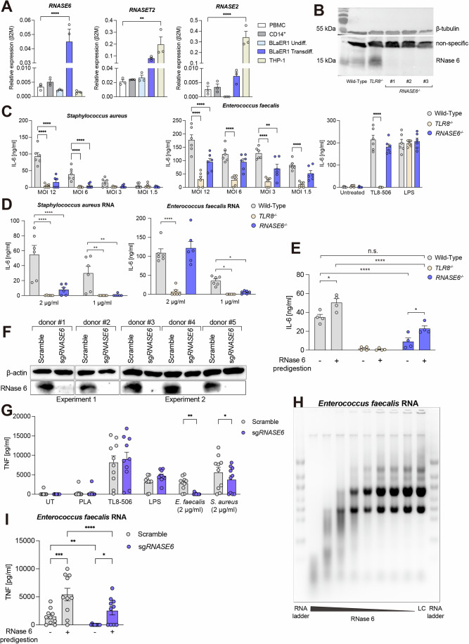 TLR8 senses single-stranded RNA (ssRNA) fragments, processed via cleavage by ribonuclease (RNase) T2 and RNase A family members. Processing by these RNases releases uridines and purine-terminated residues resulting in TLR8 activation. Monocytes show high expression of RNase 6, yet this RNase has not been analyzed for its physiological contribution to the recognition of bacterial RNA by TLR8. Here, we show a role for RNase 6 in TLR8 activation. BLaER1 cells, transdifferentiated into monocyte-like cells, as well as primary monocytes deficient for RNASE6 show a dampened TLR8-dependent response upon stimulation with isolated bacterial RNA (bRNA) and also upon infection with live bacteria. Pretreatment of bacterial RNA with recombinant RNase 6 generates fragments that induce TLR8 stimulation in RNase 6 knockout cells. 2'O-RNA methyl modification, when introduced at the first uridine in the UA dinucleotide, impairs processing by RNase 6 and dampens TLR8 stimulation. In summary, our data show that RNase 6 processes bacterial RNA and generates uridine-terminated breakdown products that activate TLR8.
