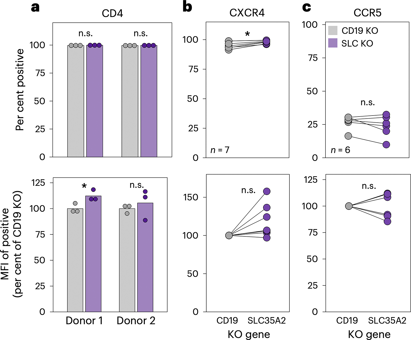 Human immunodeficiency virus type 1 (HIV-1) infection involves a selection bottleneck that leads to transmission of one or a few variants. C-C motif chemokine receptor 5 (CCR5) or C-X-C motif chemokine receptor 4 (CXCR4) can act as coreceptors for HIV-1 viral entry. However, initial infection mostly occurs via CCR5, despite abundant expression of CXCR4 on target cells. The host factors that influence HIV-1 susceptibility and selection during transmission are unclear. Here we conduct CRISPR-Cas9 screens and identify SLC35A2 (a transporter of UDP-galactose expressed in target cells in blood and mucosa) as a potent and specific CXCR4-tropic restriction factor in primary target CD4+ T cells. SLC35A2 inactivation, which resulted in truncated glycans, not only increased CXCR4-tropic infection levels but also decreased those of CCR5-tropic strains consistently. Single-cycle infections demonstrated that the effect is cell-intrinsic. These data support a role for a host protein that influences glycan structure in regulating HIV-1 infection. Host cell glycosylation may, therefore, affect HIV-1 selection during transmission in vivo.