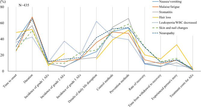 Results: Data from 435 breast cancer patients were analyzed. The most common AEs reported included hair loss (93.3%), malaise/fatigue (89.4%), nail changes (83.2%), dysgeusia (69.0%), leukopenia/white blood cell decreased (65.1%), neuropathy (62.3%), and nausea/vomiting (61.4%). Financial anxiety was reported in 35.2% of the participants. AEs for which a minority of patients found effective solutions included neuropathy (20.3%), financial anxiety (21.6%), edema (24.3%), joint pain (26.0%), and malaise/fatigue (26.7%). Patients expressed the greatest desire to avoid hair loss (34.7%), followed by nausea/vomiting (23.7%), interstitial lung disease/pneumonitis (5.5%), malaise/fatigue (5.1%), and dysgeusia (5.1%). The most commonly requested pre-treatment information regarding AEs was their duration, followed by prevention methods, management strategies, time to onset, and the impact on daily life.