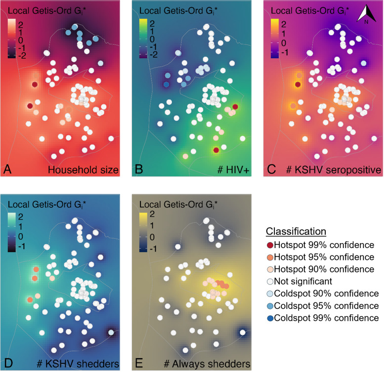 Methods: We enrolled 469 individuals from 90 households. Mouthwash rinse samples collected at three monthly visits were analyzed for KSHV DNA using quantitative polymerase chain reaction (qPCR). Generalized linear mixed effects logistic models were applied to analyze factors associated with KSHV ever shedding, and among shedders, always versus intermittent shedding. Linear mixed effects models were applied to models of KSHV viral loads. Intraclass correlation coefficients (ICCs) were calculated to assess the contribution of household-level factors to variations in shedding probabilities. Hotspot analyses of geospatial feature clusters were calculated using Getis-Ord Gi* statistic and visualized using inverse distance weighted interpolation.
