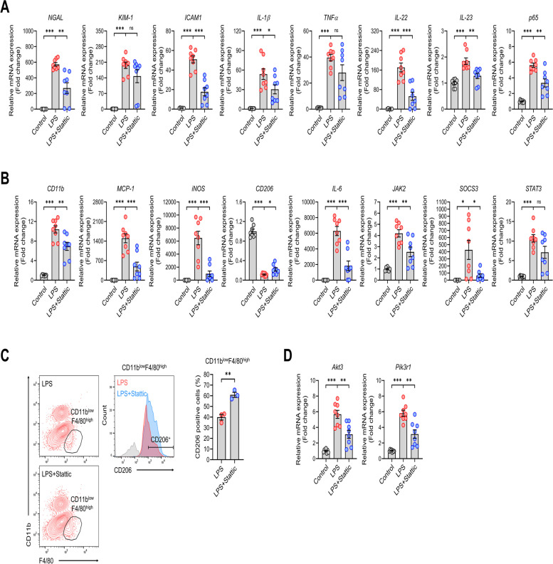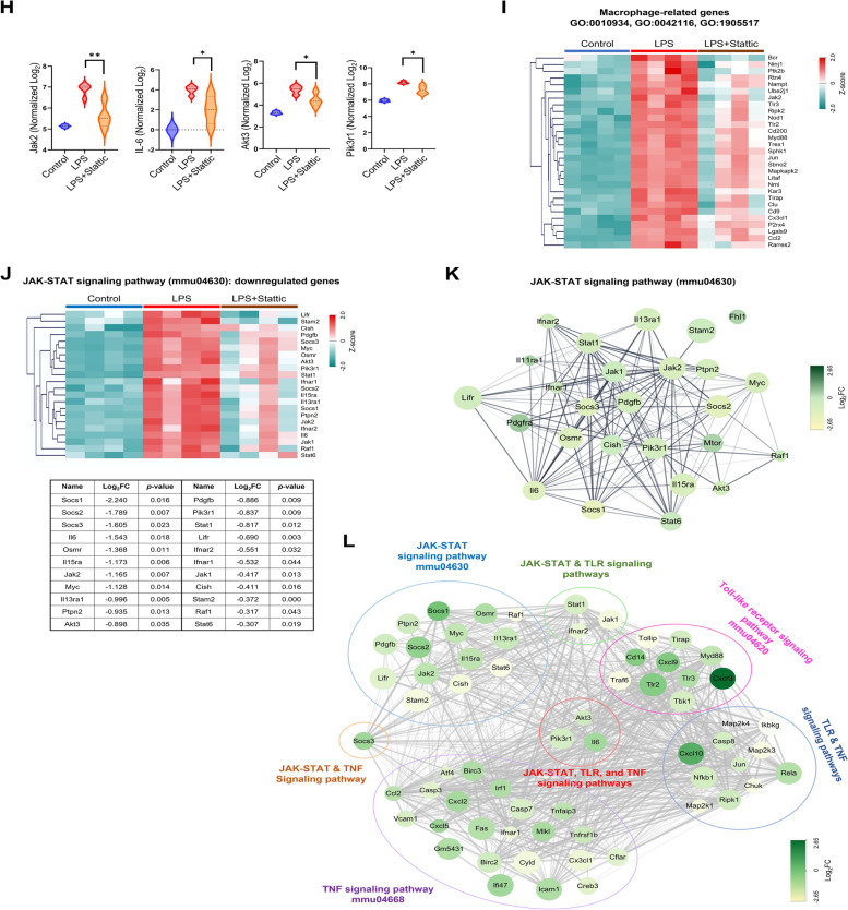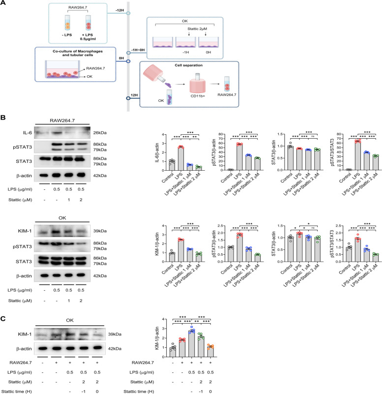 Methods: Stattic (a JAK2/STAT3 inhibitor, 5 mg/kg or 10 mg/kg) was administered to evaluate the therapeutic effect on LPS-induced AKI (L-AKI) and LPS-induced CKD (L-CKD), with animals sacrificed 6-24 h and 14 days post-LPS induction, respectively. The immune mechanisms of STAT3 blockade were determined by comparing the macrophage phenotypes and correlated with renal function parameters. Also, the transcriptomic analysis was used to confirm the anti-inflammatory effect of L-AKI, and the anti-fibrotic role was further evaluated in the L-CKD model.