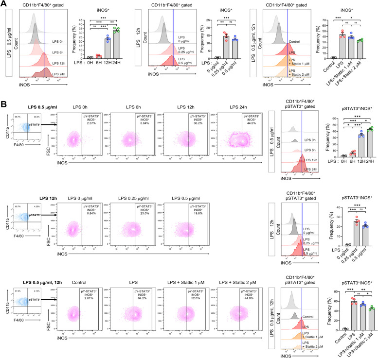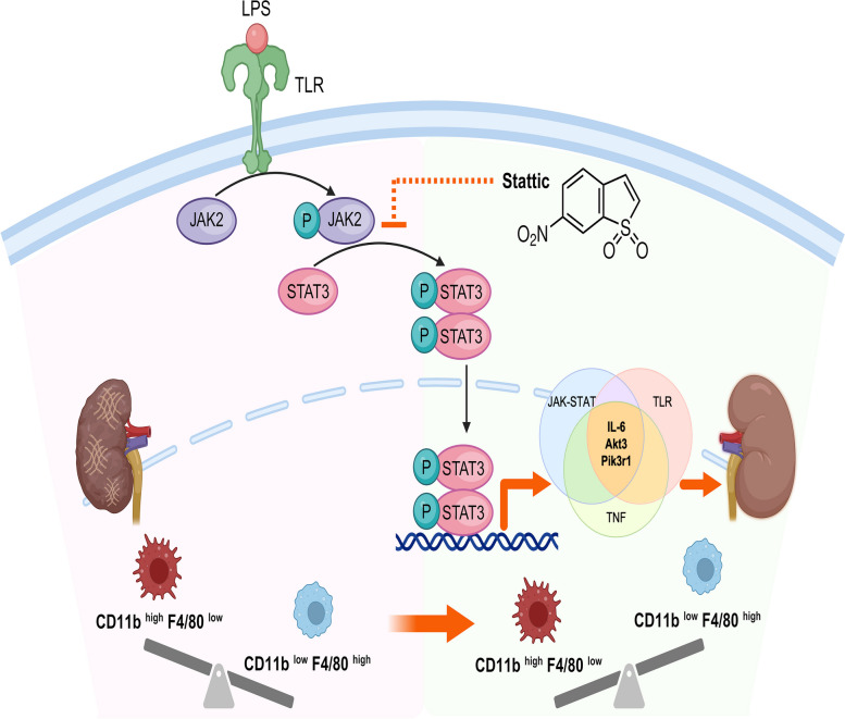 Results: In the L-AKI model, sequential increases in BUN and blood creatinine levels were time-dependent, with a marked elevation of 0-6 h after LPS injection. Notably, two newly identified macrophage subpopulations (CD11bhighF4/80low and CD11blowF4/80high), exhibited population changes, with an increase in the CD11bhighF4/80low population and a decrease in the CD11blowF4/80high macrophages. Corresponding to the FACS results, the tubular injury score, NGAL, F4/80, and p-STAT3 expression in the tubular regions were elevated. STAT3 inhibitor injection in L-AKI and L-CKD mice reduced renal injury and fibrosis. M2-type subpopulation with CD206 in CD11blowF4/80high population increased in the Stattic-treated group compared with that in the LPS-alone group in the L-AKI model. Additionally, STAT3 inhibitor reduced inflammation driven by LPS-stimulated macrophages and epithelial cells injury in the co-culture system. Transcriptomic profiling identified 3 common genes in the JAK-STAT, TLR, and TNF signaling pathways and 11 common genes in the LPS with macrophage response. The PI3K-AKT (IL-6, Akt3, and Pik3r1) and JAK-STAT pathways were determined as potential Stattic targets. Further confirmation through mRNA and protein expressions analyses showed that Stattic treatment reduced inflammation in the L-AKI and fibrosis in the L-CKD mice.