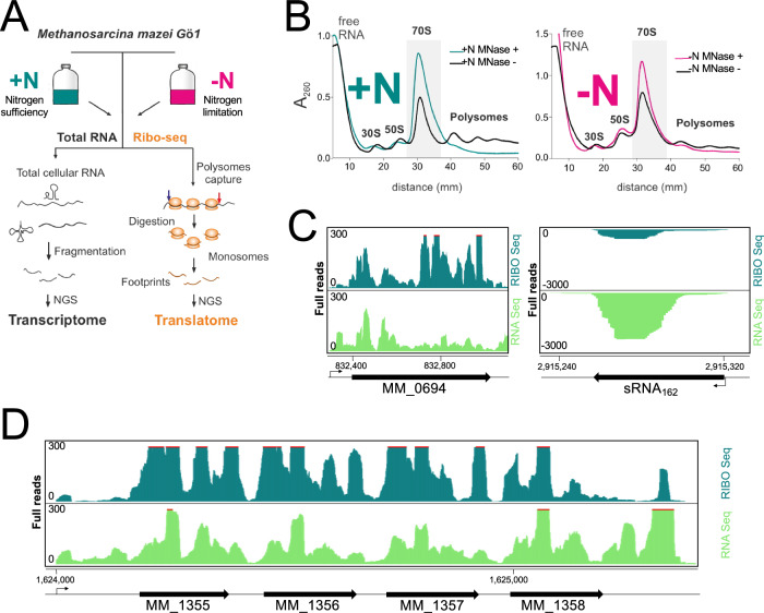 The mesophilic methanogenic archaeal model organism Methanosarcina mazei strain Gö1 is crucial for climate and environmental research due to its ability to produce methane. Here, we establish a Ribo-seq protocol for M. mazei strain Gö1 under two growth conditions (nitrogen sufficiency and limitation). The translation of 93 previously annotated and 314 unannotated small ORFs, coding for proteins ≤ 70 amino acids, is predicted with high confidence based on Ribo-seq data. LC-MS analysis validates the translation for 62 annotated small ORFs and 26 unannotated small ORFs. Epitope tagging followed by immunoblotting analysis confirms the translation of 13 out of 16 selected unannotated small ORFs. A comprehensive differential transcription and translation analysis reveals that 29 of 314 unannotated small ORFs are differentially regulated in response to nitrogen availability at the transcriptional and 49 at the translational level. A high number of reported small RNAs are emerging as dual-function RNAs, including sRNA154, the central regulatory small RNA of nitrogen metabolism. Several unannotated small ORFs are conserved in Methanosarcina species and overproducing several (small ORF encoded) small proteins suggests key physiological functions. Overall, the comprehensive analysis opens an avenue to elucidate the function(s) of multitudinous small proteins and dual-function RNAs in M. mazei.