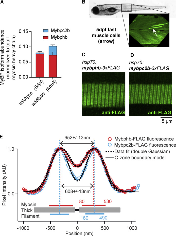 Myosin-binding protein H (MyBP-H) is a component of the vertebrate skeletal muscle sarcomere with sequence and domain homology to myosin-binding protein C (MyBP-C). Whereas skeletal muscle isoforms of MyBP-C (fMyBP-C, sMyBP-C) modulate muscle contractility via interactions with actin thin filaments and myosin motors within the muscle sarcomere "C-zone," MyBP-H has no known function. This is in part due to MyBP-H having limited expression in adult fast-twitch muscle and no known involvement in muscle disease. Quantitative proteomics reported here reveal that MyBP-H is highly expressed in prenatal rat fast-twitch muscles and larval zebrafish, suggesting a conserved role in muscle development and prompting studies to define its function. We take advantage of the genetic control of the zebrafish model and a combination of structural, functional, and biophysical techniques to interrogate the role of MyBP-H. Transgenic, FLAG-tagged MyBP-H or fMyBP-C both localize to the C-zones in larval myofibers, whereas genetic depletion of endogenous MyBP-H or fMyBP-C leads to increased accumulation of the other, suggesting competition for C-zone binding sites. Does MyBP-H modulate contractility in the C-zone? Globular domains critical to MyBP-C's modulatory functions are absent from MyBP-H, suggesting that MyBP-H may be functionally silent. However, our results suggest an active role. In vitro motility experiments indicate MyBP-H shares MyBP-C's capacity as a molecular "brake." These results provide new insights and raise questions about the role of the C-zone during muscle development.