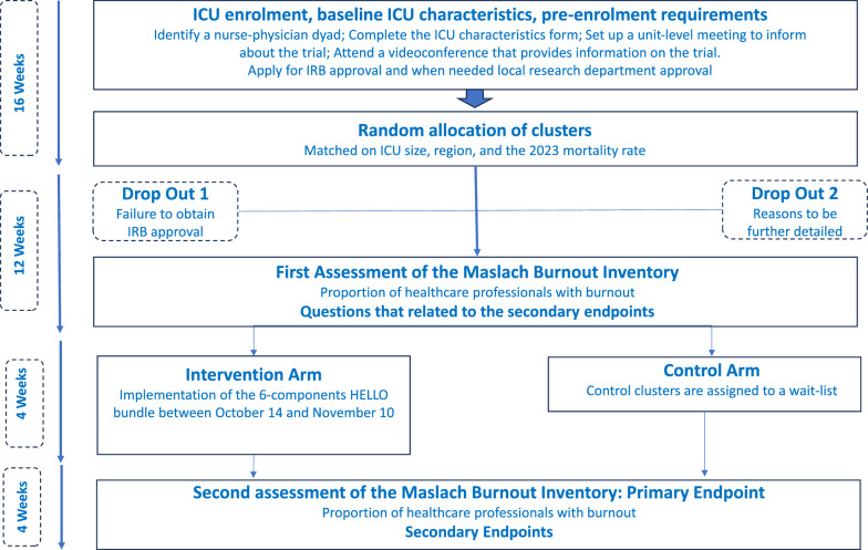 Methods: This protocol describes a cluster randomized controlled trial (RCT) conducted among ESICM-affiliated ICUs, consisting of at least 73 clusters with in average of 50 respondents per cluster, totaling approximately 7300 participants. Intervention clusters will implement the 6-component Hello Bundle between October 14 and November 10, 2024, while control clusters will be wait-listed to receive the intervention in January 2025 after the RCT concludes. Clusters will be matched based on ICU size (fewer or more than 20 beds), region, and average 2023 mortality. The primary outcome is the proportion of HCPs with burnout between intervention and control clusters at the end of the intervention. Secondary outcomes include comparing the following between clusters: (1) number of HCPs with high emotional exhaustion; (2) number with high depersonalization; (3) number with loss of accomplishment; (4) perception of ethical climate (5) satisfaction at work (VAS); (6) professional conflicts; (7) intention to leave the ICU (VAS); (8) patient-centered care rating; (9) family-centered care rating. The last secondary outcome is the comparison of burnout rates before and after the intervention in the intervention cluster. Outcomes will be based on HCP reports collected within four weeks before and after the intervention.