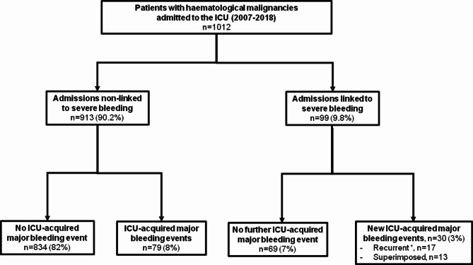 Results: A total of 1012 patients were analysed, mainly with a diagnosis of lymphoma (n = 434, 42.9%) and leukaemia or myelodysplastic syndrome (n = 266, 26.3%). Most patients were recently diagnosed (n = 340, 33.6%) and under active cancer treatment within the last 3 months (n = 604, 59.7%). The main cause for admission was infection (n = 479, 47.3%), but a significant proportion of patients were admitted for a primary haemorrhage (n = 99, 10%). ICU-acquired severe bleeding events occurred in 109 (10.8%) patients after 3.0 days [1.0-7.0] in the ICU. The main source of bleeding was the gastrointestinal tract (n = 44, 40.3%). Patients experiencing an ICU-acquired severe bleeding event displayed prolonged in-ICU length of stay (9.0 days [1.0-6.0] vs. 3.0 [3.5-15.0] in non-bleeding patients, p < 0.001) and worsened outcomes with increased in-ICU and in-hospital mortality rates (55% vs. 18.3% and 65.7% vs. 33.1%, respectively, p < 0.001). In multivariate analysis, independent predictors of ICU-acquired severe bleeding events were chronic kidney disease (cause-specific hazard 2.00 [1.19-3.31], p = 0.008), a primary bleeding event present at the time of ICU admission (CSH 4.17 [2.71-6.43], p < 0.001), non-platelet SOFA score (CSH per point increase 1.06 [1.01-1.11], p = 0.02) and prolonged prothrombin time (CSH per 5-percent increase 0.90 [0.85-0.96], p = 0.001) on the day prior to the event of interest.