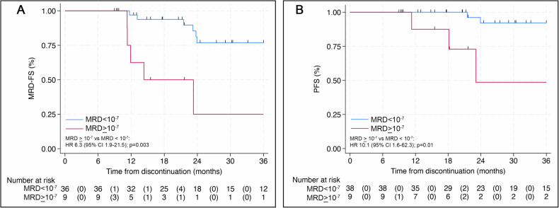 MRD2STOP is a pragmatic trial evaluating maintenance therapy cessation guided by measurable residual disease (MRD) negativity in multiple myeloma (MM). Eligible patients had previous MRD < 10-5, received ≥1 year of maintenance, and were prospectively confirmed to have undetectable disease by positron emission tomography, bone marrow (BM) flow cytometry (limit of detection [LoD] 10-5), and BM clonoSEQ (LoD 10-6). BM aspirates enriched for CD138+ cells were analyzed by clonoSEQ to achieve MRD 10-7 sensitivity. We evaluated the incidence of disease resurgence and progression-free survival (PFS), stratified by 10-7 status. Forty-seven patients discontinued maintenance after a median of 36 months. Baseline MRD ≥ 10-7 was observed in 19% (9/47). The median follow-up post-discontinuation was 30 months. Disease resurgence (MRD 10 ≥ -6) occurred in 11 patients, including 5 disease progressions. One patient died from a second cancer. The estimated 3-year cumulative incidence of disease resurgence was 20% for patients with baseline MRD < 10-7 compared to 75% for MRD ≥ 10-7 (HR 7.8, 95% CI 2.2-27.6, p = 0.001). Baseline MRD ≥ 10-7 was associated with inferior PFS compared to MRD < 10-7 (HR 10.1, 95% CI 1.6-62.3; 3-year PFS 49% vs 92%). Maintenance discontinuation in patients with MM and MRD < 10-6 led to low rates of disease resurgence. MRD < 10-7 may be a superior cessation threshold, requiring further validation.