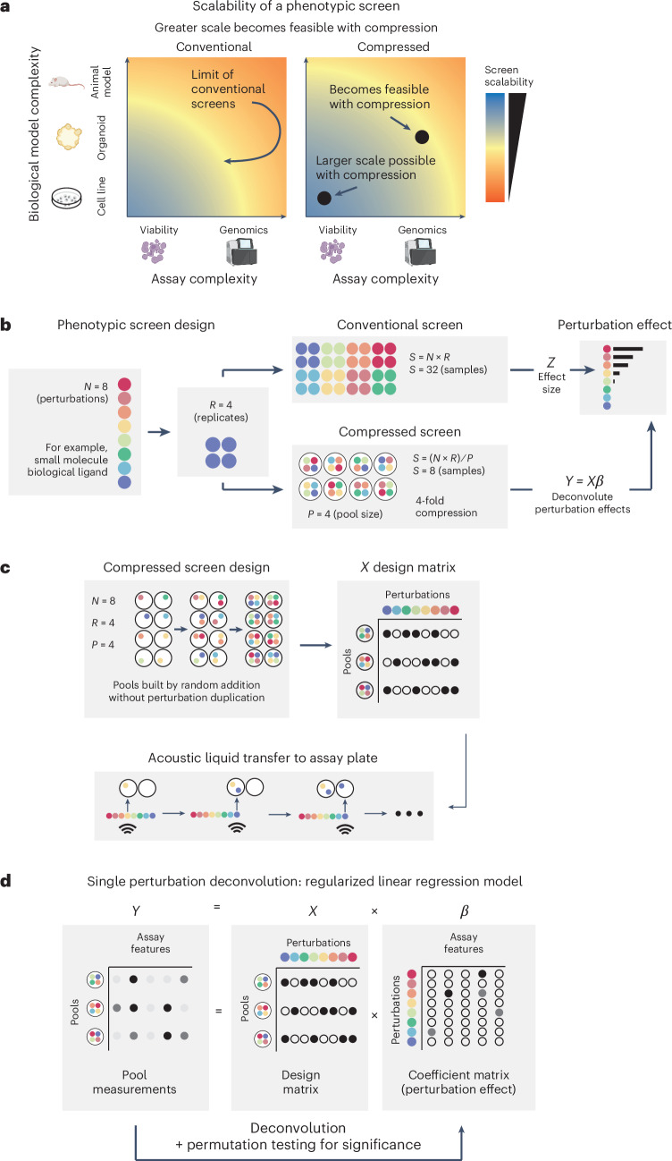 High-throughput phenotypic screens using biochemical perturbations and high-content readouts are constrained by limitations of scale. To address this, we establish a method of pooling exogenous perturbations followed by computational deconvolution to reduce required sample size, labor and cost. We demonstrate the increased efficiency of compressed experimental designs compared to conventional approaches through benchmarking with a bioactive small-molecule library and a high-content imaging readout. We then apply compressed screening in two biological discovery campaigns. In the first, we use early-passage pancreatic cancer organoids to map transcriptional responses to a library of recombinant tumor microenvironment protein ligands, uncovering reproducible phenotypic shifts induced by specific ligands distinct from canonical reference signatures and correlated with clinical outcome. In the second, we identify the pleotropic modulatory effects of a chemical compound library with known mechanisms of action on primary human peripheral blood mononuclear cell immune responses. In sum, our approach empowers phenotypic screens with information-rich readouts to advance drug discovery efforts and basic biological inquiry.
