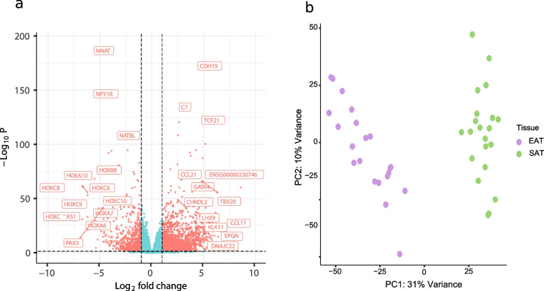 Background: Epicardial adipose tissue (EAT) surrounds the heart and is hypothesised to play a role in the development of heart failure (HF). In this study, we first investigated the differences in gene expression between epicardial adipose tissue (EAT) and subcutaneous adipose tissue (SAT) in patients undergoing elective coronary artery bypass graft (CABG) surgery (n = 21; 95% male). Secondly, we examined the association between EAT and SAT in patients at risk for HF stage A (n = 12) and in pre-HF patients, who show signs but not symptoms of HF, stage B (n = 9).