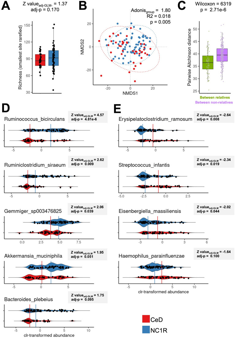 Conclusions: Overall, we evidenced that a kinship approach could be valuable in unveiling potential celiac disease microbial traits, as well as the significance of dietary factors in shaping microbial profiles and their influence on disease development and progression. Our results pave the way for designing and adopting novel dietary strategies based on gluten-free fiber-enriched ingredients to improve disease management and patients' quality of life.
