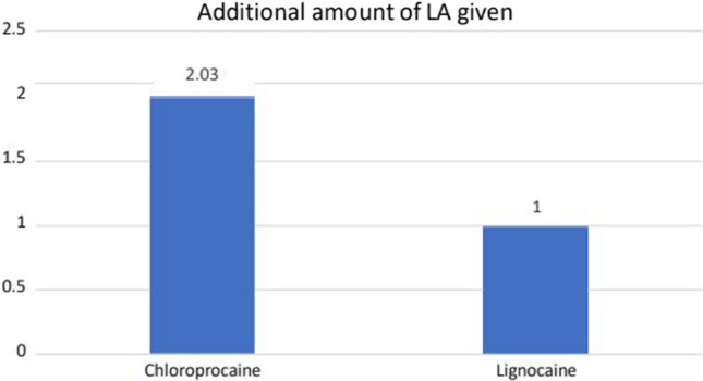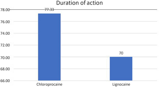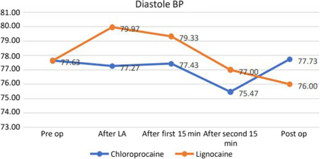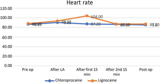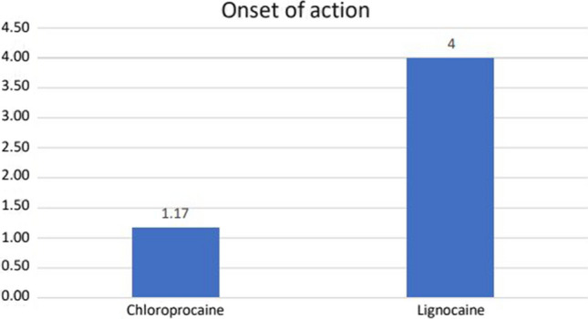 Results: Chloroprocaine had an early onset of action with a mean of 1.17 ± 0.55 min as compared to lignocaine 4.2 ± 0.48 min. Patients administered with lignocaine experienced less postoperative pain compared with chloroprocaine since the duration of action of chloroprocaine was lesser than that of lignocaine. Additional amount of LA was required when chloroprocaine was administered as compared to lignocaine. Chloroprocaine alone did not cause any appreciable changes in the hemodynamics, but lignocaine with adrenaline caused a transient increase in arterial pressure and heart rate 2 min following the administration. It was also observed that more blood was lost following chloroprocaine administration than with lignocaine.