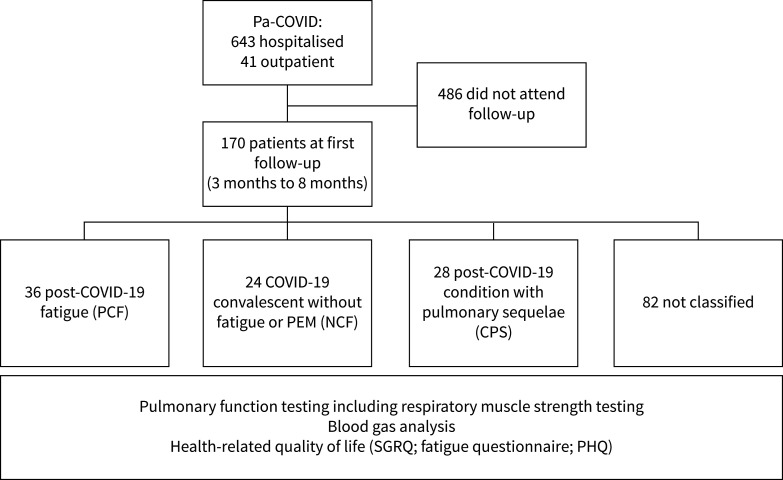 Methods: Patients treated for COVID-19 at Charité University Hospital in Berlin received pulmonary function testing including respiratory muscle strength tests and completed health-related quality-of-life questionnaires during follow-up. Patients with post-COVID-19 condition during outpatient follow-up with fatigue and exertional intolerance (PCF) were compared to patients with post-COVID-19 condition with evidence of chronic pulmonary sequelae (post-COVID-19 restriction (PCR)) as well as to patients without post-COVID-19 condition (NCF).