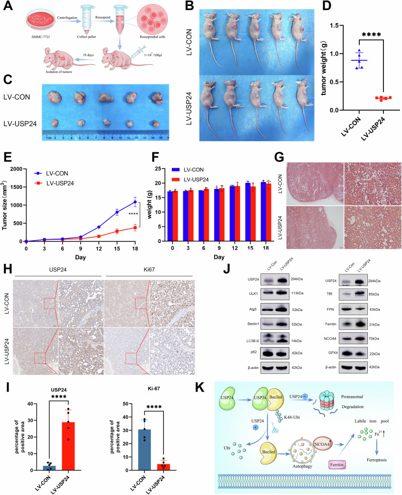 Ubiquitination is a post-translational modification (PTM), which is critical to maintain cell homeostasis. Ubiquitin-specific protease 24 (USP24) plays roles in various diseases, the mechanisms by which USP24 regulates hepatocellular carcinoma (HCC) remain poorly understood. In this study, USP24 is found to be significantly downregulated in HCC. Knocking down USP24 promotes HCC proliferation and migration, whereas USP24 overexpression inhibits HCC in vitro and in vivo. The endogenous interaction between USP24 and Beclin1 is confirmed. Mechanically, USP24 delays Beclin1 degradation by reducing its K48-linked ubiquitination, the effects of overexpressing USP24 on HCC proliferation can be partially reversed by silencing Beclin1. We find that increased autophagy is accompanied by ferroptosis in USP24 overexpressed HCC cells and USP24 increases the susceptibility of HCC to sorafenib. Collectively, this study highlights the critical role of USP24 in regulating autophagy-dependent ferroptosis by decreasing Beclin1 ubiquitination, suggesting that targeting USP24 may be a strategy for treating HCC.