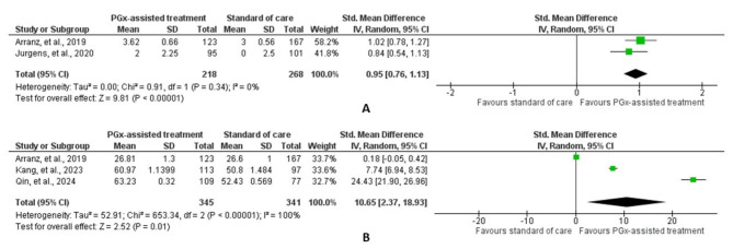Results: A total of 18,821 studies were screened, and five were included for review. All the RCTs had a high risk of bias. Four studies included the commonly used antipsychotics. Three studies reported negative outcomes (safety, efficacy, and medication adherence) and two reported positive outcomes (safety) using different scales. In the meta-analysis, there were significant differences in the total Udvalg for Kliniske Undersogelser Side-Effect Rating scale score [SMD 0.95 (95% CI: 0.76-1.13), p < 0.001); I2 = 0%] and the total Positive and Negative Syndrome Scale score [SMD 10.65 (95% CI: 2.37-18.93), p = 0.01); I2 = 100%] between the PGx-assisted treatment and standard of care arms. However, the results were inconsistent, and the certainty of evidence (GRADE criteria) was very low.