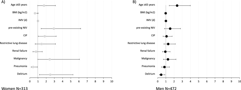 Results: A total of 785 patients were included, of whom 313 (39.9%) were women. 77.9% of the women and 75.4% of the men were successfully weaned from invasive ventilation. In group comparisons and multivariable analyses, sex was not found to be a risk factor for weaning failure. Cox regression analyses were performed separately for both sexes on the outcome of weaning failure, adjusting for relevant covariates. The results indicated that age ≥ 65 years (HR 2.38, p < 0.001) and the duration of IMV before transfer to the weaning centre (HR 1.01/day, p < 0.001) were independent risk factors in men. In women, however, the duration of IMV before transfer (HR 1.01, p < 0.001), previous non-invasive ventilation (HR 2.9, p 0.005), the presence of critical illness polyneuropathy (HR 1.82; p = 0.040) and delirium (HR 2.50, p = 0.017) were identified as relevant risk factors. In contrast delirium was associated with a favourable weaning outcome in men (HR 0.38, p = 0.020) and nosocomial pneumonia as a reason for prolonged weaning in women (HR 0.43; p = 0.032).