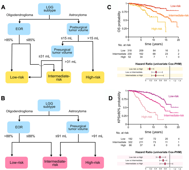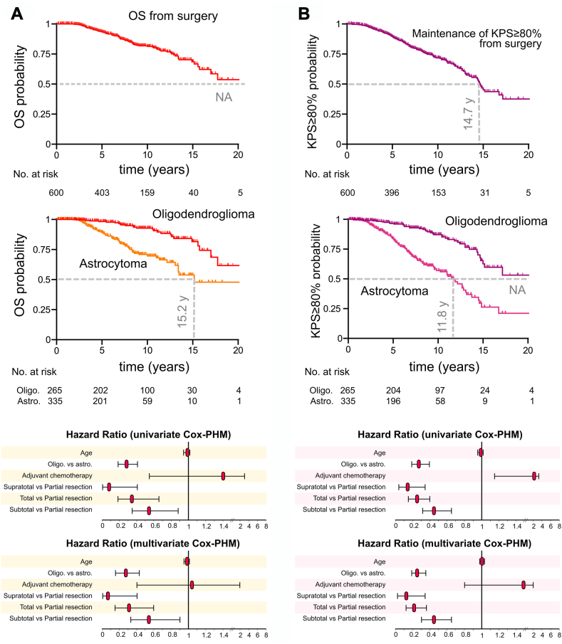 Findings: 600 patients were included in the cohort (274 female [46.0%], median age: 36 years [Interquartile range, IQR: 30-44 years]). The rate of return to work was 93.7%. The impact of surgery on cognition was of limited magnitude. The median postsurgical TV of 2.5 mL (IQR: 0-8.0 mL). The median OS was over 20 years (median: NA, 95% CI: 17.0-NA years). The median OSKPS ≥ 80% was 14.7 years (95% CI: 13.2-17.2 years). Factors associated with longer OS and OSKPS ≥ P80% were 1p19q codeletion (Hazard ratio [HR]OS: 0.27, 95% CI: 0.16-0.43, HRKPS ≥ 80%:0.25, 95% CI: 0.17-0.36), supratotal resection (HROS: 0.08, 95% CI: 0.005-0.40, HRKPS ≥ 80%:0.12, 95% CI: 0.03-0.34) and total resection (HROS: 0.31, 95% CI: 0.16-0.59, HRKPS ≥ 80%:0.21, 95% CI: 0.12-0.36). Recursive partitioning analyses established three OS and OSKPS ≥ 80% prognostic groups, highlighting the contributions of histomolecular status, extent of resection, postsurgical and presurgical TV. Further propensity-matching analyses confirmed the oncological benefits of supratotal resections.