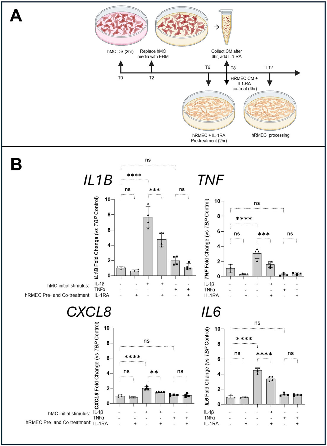 Ocular levels of IL-1β, TNFα, IL-8, and IL-6 correlate with progression of diabetic retinopathy (DR). Müller cells (MC), which are crucial to maintaining retinal homeostasis, are targets and sources of these cytokines. We explored the relative capacities of these four DR-associated cytokines to amplify inflammatory signal expression both in and between human MC (hMC) and retinal microvascular endothelial cells (hRMEC) and in the mouse retina. Of the four cytokines, IL-1β was the most potent stimulus of transcriptomic alterations in hMC and hRMEC in vitro, as well as in the mouse retina after intravitreal injection in vivo. Stimulation with IL-1β significantly induced expression of all four transcripts in hMC and hRMEC. TNFα significantly induced expression of some, but not all, of the four transcripts in each cell, while neither IL-8 nor IL-6 showed significant induction in either cell. Similarly, conditioned media (CM) derived from hMC or hRMEC treated with IL-1β, but not TNFα, upregulated inflammatory cytokine transcripts in the reciprocal cell type. hRMEC responses to hMC-derived CM were dependent on IL-1R activation. In addition, we observed a correlation between cytokine expression changes following direct and CM stimulation and NFκB-p65 nuclear translocation in both hMC and hRMEC. Finally, in mice, intravitreal injections of IL-1β, but not TNFα, induced retinal expression of Il1b and CXCL8 homologues Cxcl1, Cxcl2, Cxcl3, and Cxcl5, encoding pro-angiogenic chemokines. Our results suggest that expression of IL-1β, TNFα, IL-8, and IL-6 may be initiated, propagated, and sustained by autocrine and paracrine signals in hRMEC and hMC through a process involving IL-1β and NFκB. Targeting these signals may help thwart inflammatory amplification, preventing progression to vision-threatening stages and preserving sight.