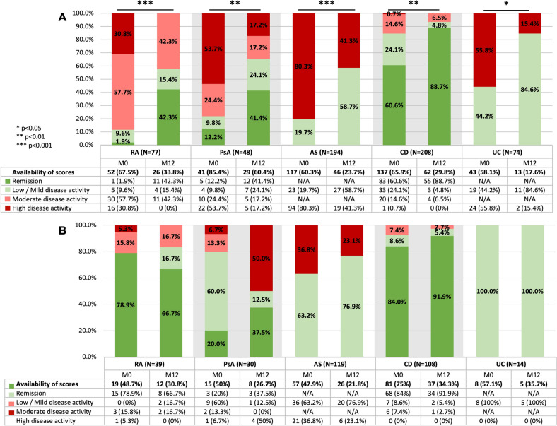 Declarations. Funding: This study was sponsored by Biogen Int GmbH (Baar, Switzerland). Funding was provided by Biogen. Open access fees were sponsored by Biogen Int GmbH (Baar, Switzerland). Conflict of interest: Bruno Fautrel: received speaker/consulting fees from AbbVie, Biogen, Boehringer Ingelheim, BMS, Celgene, Janssen, Lilly, Medac, MSD, NORDIC Pharma, Novartis, Pfizer, Roche, Sobi and UCB, and grant/research support from AbbVie, MSD and Pfizer. Yoram Bouhnik: received consultancy and/or speaker fees from AbbVie, Biogaran, Biogen, Boehringer Ingelheim, CTMA, Ferring, Gilead, Hospira, ICON, Inception IBD, Janssen, Lilly, Mayoly Spindler, Merck, Merck Sharp & Dohme, Norgine, Pfizer, Robarts Clinical Trials, Roche, Sanofi, Shire, Takeda, UCB and Vifor Pharma. Carine Salliot: received consultancy and/or speaker fees from Novartis, Roche-Chugai, Pfizer and Galapagos, and grant/research support from Roche-Chugai and Novartis. Frank Carbonnel: received speaker fees from Abbvie, Astra, Biocodex, Biogen, Ferring, Janssen, MSD, Pfizer, Pileje, Takeda, Tillotts; and is a member of advisory boards for Amgen, Arena, BMS, Celltrion, Enterome, Ferring, Janssen, Medtronic, Pfizer, Pharmacosmos, Roche and Tillotts. Mathurin Fumery: received consultancy and/or speaker fees from AbbVie, Biogen, Boehringer Ingelheim, CTMA, Ferring, Gilead, Hospira, Janssen, Lilly, Merck Sharp & Dohme, Pfizer, Takeda, Tillots and Celgene. Chirstophe Bernardeau: nothing to disclose with respect to their contributions to this work. Yves Maugars: nothing to disclose with respect to their contributions to this work. Mathurin Flamant: received consultancy and/or speaker fees from AbbVie, Amgen, Biogen, Ferring, Janssen, Mayoly Spindler, Merck Sharp & Dohme, Pfizer, Takeda, Tillots and Pharma. Fabienne Coury: received speaker/consulting fees from Abbvie, Amgen, BMS, Janssen, Lilly, MSD, Novartis, Pfizer, Roche-Chugai, Sanofi and UCB, and grant/research support from Abbvie, Biogen, Celgene, Chugai, Novartis, Pfizer and UCB. Ben Braithwaite: no conflicts of interest to disclose. Salima Hateb: is an employee of and may hold stock in Biogen. Janet Addison: is an employee of and may hold stock in Biogen. Availability of data and material: The datasets generated and analysed during the current study are not publicly available as data for this study contain potentially identifying information. Ethics approval: All necessary ethical considerations and measures were taken to ensure the protection of all participants: patients were eligible for the study only if they were able to understand and sign a consent form. This study is listed on clinicaltrials.gov under the identifier NCT03662919 and was approved by the appropriate bodies in terms of quality of methodology, data security and scientific merit. The final amendment to the protocol for this study was approved by an independent ethics committee (Comité de Protection des Personnes, CPP) in France on 25 April 2019, in accordance with French regulations (CPP SUD-EST II; study ref. 2018-06; internal ref. 19.03.29.73319). Furthermore, this study conformed to all regulations concerning the use of personal data. All procedures were carried out in accordance with the ethical rules and the principles of the Declaration of Helsinki and its later amendments. Consent to participate: Informed consent was obtained from all individual participants included in the study in the form of a non-opposition form signed and archived by the physician in accordance with French regulations. Code availability: The code used to perform data management and run the analyses uses proprietary modules owned by eXYSTAT. Thus, the code cannot be made publicly available. Author contributions: Bruno Fautrel: as the coordinating investigator for rheumatology, made substantial contributions to the conception and design of the work, the acquisition and interpretation of data for the work and reviewed all draft versions of the manuscript for important intellectual content. Yoram Bouhnik: as the coordinating investigator for gastroenterology, made substantial contributions to the conception and design of the work, the acquisition and interpretation of data for the work and reviewed all draft versions of the manuscript for important intellectual content. Carine Salliot: as an investigator, made substantial contributions to the acquisition and interpretation of data for the work and reviewed all draft versions of the manuscript for important intellectual content. Mathurin Fumery: as an investigator, made substantial contributions to the acquisition and interpretation of data for the work and reviewed all draft versions of the manuscript for important intellectual content. Chirstophe Bernardeau: as an investigator, made substantial contributions to the acquisition and interpretation of data for the work and reviewed all draft versions of the manuscript for important intellectual content. Mathurin Flamant: as an investigator, made substantial contributions to the acquisition and interpretation of data for the work and reviewed all draft versions of the manuscript for important intellectual content. Fabienne Coury: as an investigator, made substantial contributions to the acquisition and interpretation of data for the work and reviewed all draft versions of the manuscript for important intellectual content. Ben Braithwaite: as the lead writer and biostatistics coordinator for this work, made substantial contributions to the design of the work, acquisition, analysis and interpretation of data for the work and produced all draft versions of the manuscript. Salima Hateb: as a study coordinator for the sponsor, made substantial contributions to the conception and design of the work, the acquisition and interpretation of data for the work and reviewed all draft versions of the manuscript for important intellectual content. Janet Addison: as the sponsor’s lead scientist for this work, made substantial contributions to the conce