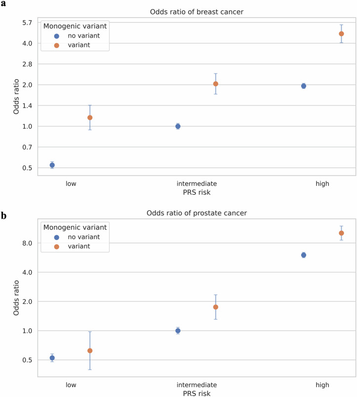 Polygenic risk score (PRS) and rare monogenic variant screening are valuable tools for predicting cancer risk and identifying individuals at high risk. Integrating both common and rare genetic variants is crucial for accurate risk assessment. However, estimating the impacts of rare variants on cancer and combining them with PRS remains challenging. Here, we analyze 454,711 exome sequencing and 487,409 array UK Biobank samples, focusing on breast and prostate cancers. We introduce an expanded PRS (EPRS) approach, yielding a systematic model for more effective risk stratification. By prioritizing and clustering genes with cancer-specific rare variants based on odds ratios and population-attributable fraction, we refine risk stratification by combining both monogenic and polygenic effects. Individuals in high-PRS groups with rare high-impact gene variants show up to 15- and 22-fold higher risk for breast and prostate cancers, respectively, compared to those in the intermediate-PRS groups without rare variants. Combined risk profiles vary across distinct rare variant clusters within the same PRS group for both cancers. Our EPRS approach enhances risk stratification for breast and prostate cancers, offering important insights for future research and potential applications to other cancer types.