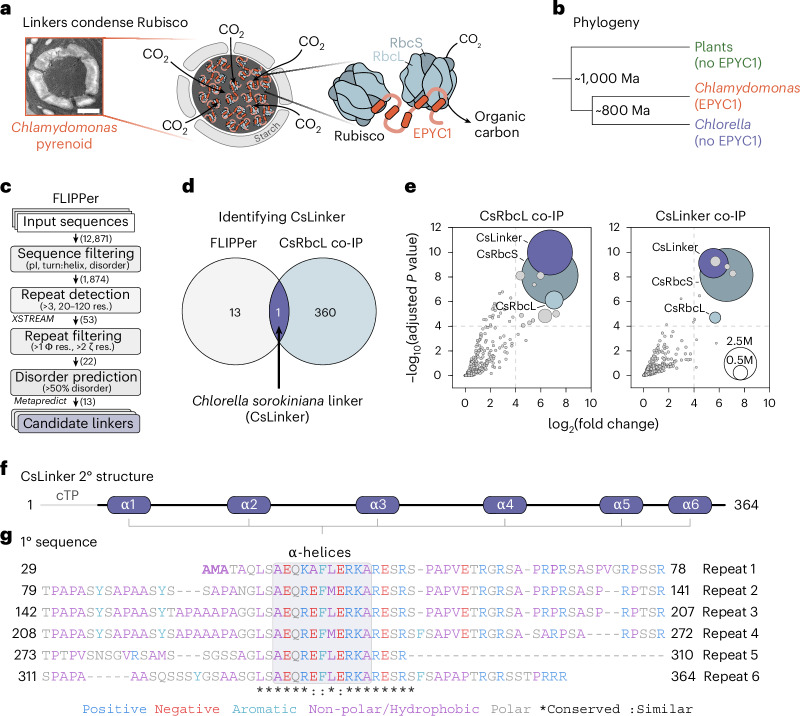 CO2 fixation is commonly limited by inefficiency of the CO2-fixing enzyme Rubisco. Eukaryotic algae concentrate and fix CO2 in phase-separated condensates called pyrenoids, which complete up to one-third of global CO2 fixation. Condensation of Rubisco in pyrenoids is dependent on interaction with disordered linker proteins that show little conservation between species. We developed a sequence-independent bioinformatic pipeline to identify linker proteins in green algae. We report the linker from Chlorella and demonstrate that it binds a conserved site on the Rubisco large subunit. We show that the Chlorella linker phase separates Chlamydomonas Rubisco and that despite their separation by ~800 million years of evolution, the Chlorella linker can support the formation of a functional pyrenoid in Chlamydomonas. This cross-species reactivity extends to plants, with the Chlorella linker able to drive condensation of some native plant Rubiscos in vitro and in planta. Our results represent an exciting frontier for pyrenoid engineering in plants, which is modelled to increase crop yields.