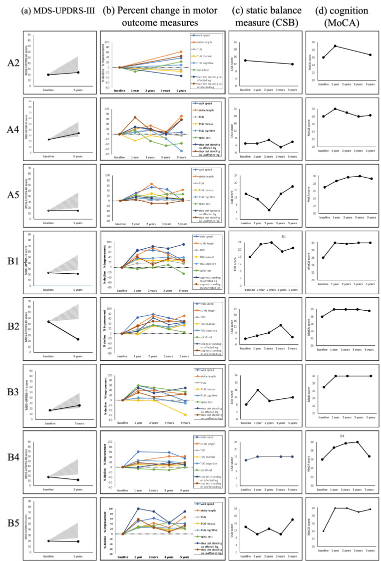 Results: Of the seven participants who had continued photobiomodulation therapy, one had a preliminary diagnosis of multisystem atrophy and was excluded from the group analysis. For the remaining six participants, there was a significant improvement in walk speed, stride length, timed up-and-go tests, tests of dynamic balance, and cognition compared to baseline and nonsignificant improvements in all other measures, apart from MDS-UPDRS-III, which was unchanged and one measure of static balance (single leg stance, standing on the unaffected leg with eyes open) which declined. Five of six participants either improved or showed no decline in MDS-UPDRS-III score and most participants showed improvement or no decline in all other outcome measures. No adverse effects of the photobiomodulation therapy were reported.
