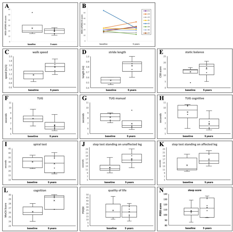 Methods: Eight participants of the initial 12 in a previously published study agreed to be reassessed after five years. Seven of these participants had continued home-based, self-applied photobiomodulation therapy three times per week for five years. One participant had discontinued treatment after one year. Participants were assessed for a range of clinical motor signs, including MDS-UPDRS-III, measures of mobility and balance. Cognition was assessed objectively, and quality of life and sleep quality were assessed using self-reported questionnaires. A Wilcoxon Signed Ranks test was used to evaluate change in outcome measures between baseline (before treatment) and after five years, with the alpha value set to 0.05.