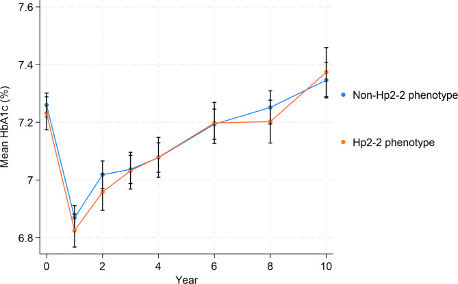 Methods: Cox regression models with time-varying covariables were used to quantify the association between time-varying achieved HbA1c (< 6.5%, 6.5-6.9%, and ≥ 8.0% compared to 7.0-7.9%), updated at years 1-4, 6, 8, and 10, and incident CAD in the Hp2-2 (n = 1,587) and non-Hp2-2 (n = 2,944) phenotypes separately. Further pre-specified subgroup analyses by age, sex, history of cardiovascular disease (CVD), race, and diabetes duration were performed in each Hp phenotype group separately.