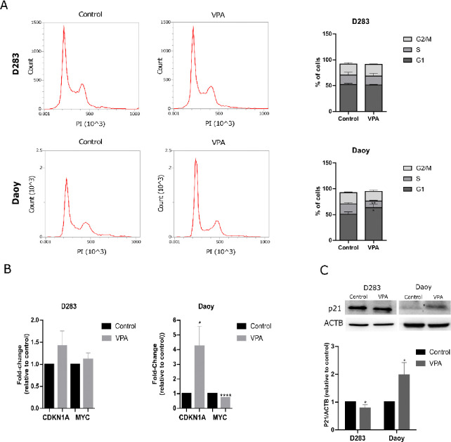 Changes in epigenetic processes such as histone acetylation are proposed as key events influencing cancer cell function and the initiation and progression of pediatric brain tumors. Valproic acid (VPA) is an antiepileptic drug that acts partially by inhibiting histone deacetylases (HDACs) and could be repurposed as an epigenetic anticancer therapy. Here, we show that VPA reduced medulloblastoma (MB) cell viability and led to cell cycle arrest. These effects were accompanied by enhanced H3K9 histone acetylation (H3K9ac) and decreased expression of the MYC oncogene. VPA impaired the expansion of MB neurospheres enriched in stemness markers and reduced MYC while increasing TP53 expression in these neurospheres. In addition, VPA induced morphological changes consistent with neuronal differentiation and the increased expression of differentiation marker genes TUBB3 and ENO2. The expression of stemness genes SOX2, NES, and PRTG was differentially affected by VPA in MB cells with different TP53 status. VPA increased H3K9 occupancy of the promoter region of TP53. Among the genes regulated by VPA, the stemness regulators MYC and NES showed an association with patient survival in specific MB subgroups. Our results indicate that VPA may exert antitumor effects in MB by influencing histone acetylation, which may result in the modulation of stemness, neuronal differentiation, and the expression of genes associated with patient prognosis in specific molecular subgroups. Importantly, the actions of VPA in MB cells and neurospheres include a reduction in the expression of MYC and an increase in TP53.