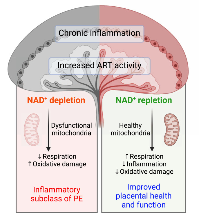 Preeclampsia (PE) is a hypertensive disorder of pregnancy and a major cause of maternal/perinatal adverse health outcomes with no effective therapeutic strategies. Our group previously identified distinct subclasses of PE, one of which exhibits heightened placental inflammation (inflammation-driven PE). In non-pregnant populations, chronic inflammation is associated with decreased levels of cellular NAD+, a vitamin B3 derivative involved in energy metabolism and mitochondrial function. Interestingly, specifically in placentas from women with inflammation-driven PE, we observed the increased activity of NAD+-consuming enzymes, decreased NAD+ content, decreased expression of mitochondrial proteins, and increased oxidative damage. HTR8 human trophoblasts likewise demonstrated increased NAD+-dependent ADP-ribosyltransferase (ART) activity, coupled with decreased mitochondrial respiration rates and invasive function under inflammatory conditions. Such adverse effects were attenuated by boosting cellular NAD+ levels with nicotinamide riboside (NR). Finally, in an LPS-induced rat model of inflammation-driven PE, NR administration (200 mg/kg/day) from gestational days 1-19 prevented maternal hypertension and fetal/placental growth restriction, improved placental mitochondrial function, and reduced inflammation and oxidative stress. This study demonstrates the critical role of NAD+ in maintaining placental function and identifies NAD+ boosting as a promising preventative strategy for PE.