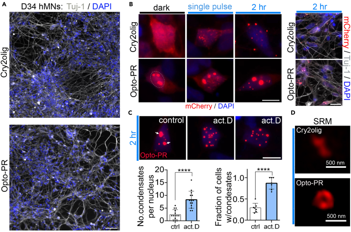 Proteinaceous inclusions formed by C9orf72-derived dipeptide-repeat (DPR) proteins are a histopathological hallmark in ∼50% of familial amyotrophic lateral sclerosis/frontotemporal dementia (ALS/FTD) cases. However, DPR aggregation/inclusion formation could not be efficiently recapitulated in cell models for four out of five DPRs. In this study, using optogenetics, we achieved chemical-free poly-PR condensation/aggregation in cultured cells including human motor neurons, with spatial and temporal control. Strikingly, nuclear poly-PR condensates had anisotropic, hollow-center appearance, resembling TDP-43 anisosomes, and their growth was limited by RNA. These condensates induced abnormal TDP-43 granulation in the nucleus without stress response activation. Cytoplasmic poly-PR aggregates forming under prolonged opto-stimulation were more persistent than its nuclear condensates, selectively sequestered TDP-43 in a demixed state and surrounded spontaneous stress granules. Thus, poly-PR condensation accompanied by nuclear TDP-43 dysfunction may constitute an early pathological event in C9-ALS/FTD. Anisosome-type condensates of disease-linked proteins may represent a common molecular species in neurodegenerative disease.