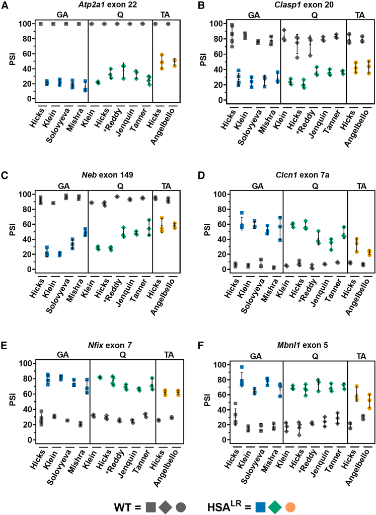Myotonic dystrophy type 1 (DM1), the leading cause of adult-onset muscular dystrophy, is caused by a CTG repeat expansion. Expression of the repeat causes widespread alternative splicing (AS) defects and downstream pathogenesis, including significant skeletal muscle impacts. The HSA LR mouse model plays a significant role in therapeutic development. This mouse model features a transgene composed of approximately 220 interrupted CTG repeats, which results in skeletal muscle pathology that mirrors DM1. To better understand this model and the growing number of therapeutic approaches developed with it, we performed a meta-analysis of publicly available RNA sequencing data for AS changes across three widely examined skeletal muscles: quadriceps, gastrocnemius, and tibialis anterior. Our analysis demonstrated that transgene expression correlated with the extent of splicing dysregulation across these muscles from gastrocnemius (highest), quadriceps (medium), to tibialis anterior (lowest). We identified 95 splicing events consistently dysregulated across all examined datasets. Comparison of splicing rescue across seven therapeutic approaches showed a range of rescue across the 95 splicing events from the three muscle groups. This analysis contributes to our understanding of the HSA LR model and the growing number of therapeutic approaches currently in preclinical development for DM1.