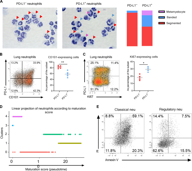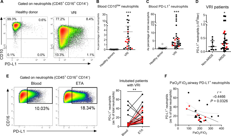 Neutrophil subsets endowed with regulatory/suppressive properties are widely regarded as deleterious immune cells that can jeopardize antitumoral response and/or antimicrobial resistance. Here, we describe a sizeable fraction of neutrophils characterized by the expression of programmed death-ligand 1 (PD-L1) in biological fluids of humans and mice with severe viral respiratory infections (VRI). Biological and transcriptomic approaches indicated that VRI-driven PD-L1+ neutrophils are endowed with potent regulatory functions and reduced classical antimicrobial properties, as compared to their PD-L1- counterpart. VRI-induced regulatory PD-L1+ neutrophils were generated remotely in the bone marrow in an IFN-γ-dependent manner and were quickly mobilized into the inflamed lungs where they fulfilled their maturation. Neutrophil depletion and PD-L1 blockade during experimental VRI resulted in higher mortality, increased local inflammation, and reduced expression of resolving factors. These findings suggest that PD-L1+ neutrophils are important players in disease tolerance by mitigating local inflammation during severe VRI and that they may constitute relevant targets for future immune interventions.
