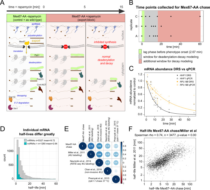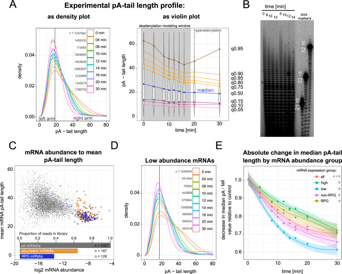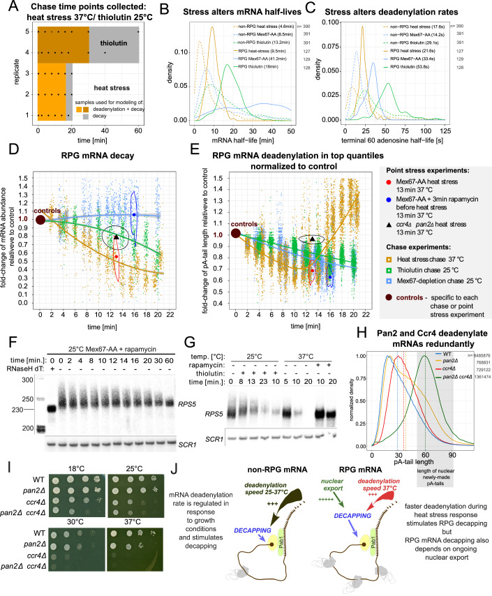 Complete cytoplasmic polyadenosine tail (polyA-tail) deadenylation is thought to be essential for initiating mRNA decapping and subsequent degradation. To investigate this prevalent model, we conducted direct RNA sequencing of S. cerevisiae mRNAs derived from chase experiments under steady-state and stress condition. Subsequently, we developed a numerical model based on a modified gamma distribution function, which estimated the transcriptomic deadenylation rate at 10 A/min. A simplified independent method, based on the delineation of quantile polyA-tail values, showed a correlation between the decay and deadenylation rates of individual mRNAs, which appeared consistent within functional transcript groups and associated with codon optimality. Notably, these rates varied during the stress response. Detailed analysis of ribosomal protein-coding mRNAs (RPG mRNAs), constituting 40% of the transcriptome, singled out this transcript group. While deadenylation and decay of RPG mRNAs accelerated under heat stress, their degradation could proceed even when deadenylation was blocked, depending entirely on ongoing nuclear export. Our findings support the general primary function of deadenylation in dictating the onset of decapping, while also demonstrating complex relations between these processes.