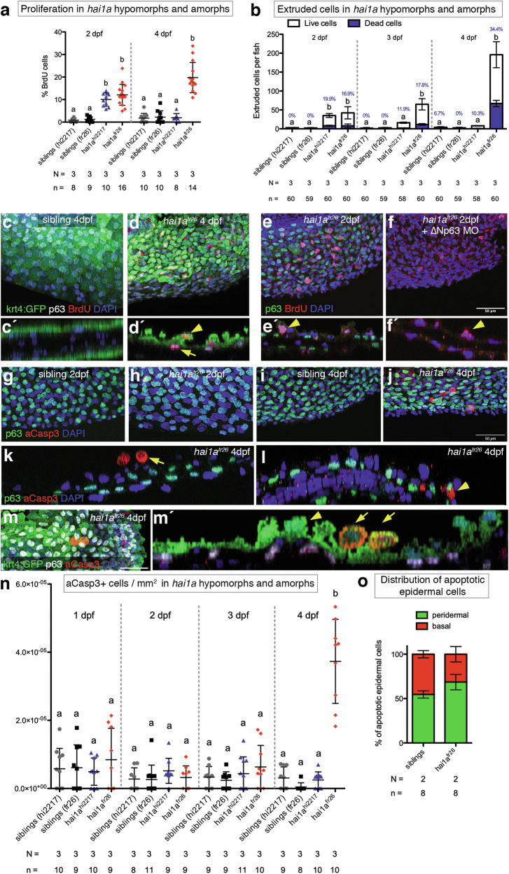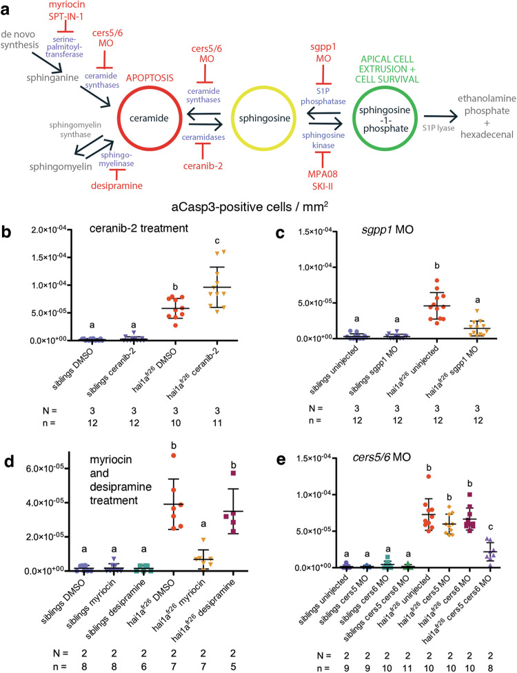 Evasion of cell death is a hallmark of cancer, and consequently the induction of cell death is a common strategy in cancer treatment. However, the molecular mechanisms regulating different types of cell death are poorly understood. We have formerly shown that in the epidermis of hypomorphic zebrafish hai1a mutant embryos, pre-neoplastic transformations of keratinocytes caused by unrestrained activity of the type II transmembrane serine protease Matriptase-1 heal spontaneously. This healing is driven by Matriptase-dependent increased sphingosine kinase (SphK) activity and sphingosine-1-phosphate (S1P)-mediated keratinocyte loss via apical cell extrusion. In contrast, amorphic hai1afr26 mutants with even higher Matriptase-1 and SphK activity die within a few days. Here we show that this lethality is not due to epidermal carcinogenesis, but to aberrant tp53-independent apoptosis of keratinocytes caused by increased levels of pro-apoptotic C16 ceramides, sphingolipid counterparts to S1P within the sphingolipid rheostat, which severely compromises the epidermal barrier. Mathematical modelling of sphingolipid rheostat homeostasis, combined with in vivo manipulations of components of the rheostat or the ceramide de novo synthesis pathway, indicate that this unexpected overproduction of ceramides is caused by a negative feedback loop sensing ceramide levels and controlling ceramide replenishment via de novo synthesis. Therefore, despite their initial decrease due to increased conversion to S1P, ceramides eventually reach cell death-inducing levels, making transformed pre-neoplastic keratinocytes die even before they are extruded, thereby abrogating the normally barrier-preserving mode of apical live cell extrusion. Our results offer an in vivo perspective of the dynamics of sphingolipid homeostasis and its relevance for epithelial cell survival versus cell death, linking apical cell extrusion and apoptosis. Implications for human carcinomas and their treatments are discussed.