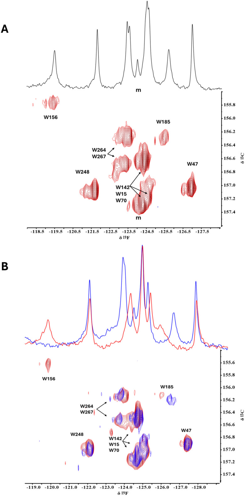 Tryptophan plays a critical role in proteins by contributing to stability, allostery, and catalysis. Using fluorine (19F) nuclear magnetic resonance (NMR), protein conformational dynamics and structure-activity relationships (SARs) can be studied via fluorotryptophan reporters. Tryptophan analogs such as 4-, 5-, 6-, or 7-fluorotryptophan can be routinely incorporated into proteins during heterologous expression by arresting endogenous tryptophan biosynthesis. Building upon the large 19F chemical shift dispersion associated with 5-fluorotryptophan, we introduce an approach to the incorporation of 13C-enriched 5-fluorotryptophan using a direct biosynthetic precursor, 5-fluoroanthranilic acid-(phenyl-13C6). The homodimeric enzyme fluoroacetate dehalogenase (FAcD), a thermophilic alpha/beta hydrolase responsible for the hydrolysis of a C-F bond in fluoroacetate, was expressed and biosynthetically labeled with (phenyl-13C6) 5-fluorotryptophan. The resulting two-dimensional 19F-13C (transverse relaxation optimized spectroscopy) TROSY heteronuclear correlation spectra provide complete resolution of all 9 tryptophan residues in the apo enzyme and FAcD saturated with the substrate analog bromoacetate. The (19F,13C) correlation spectra also reveal a multitude of minor resonances in the apo sample. The role of each tryptophan residue in allosteric communication was validated with computational rigidity transmission allostery analysis, which in this case explores the relative interprotomer communication between all possible tryptophan pairs.