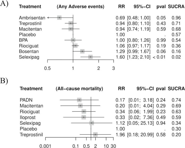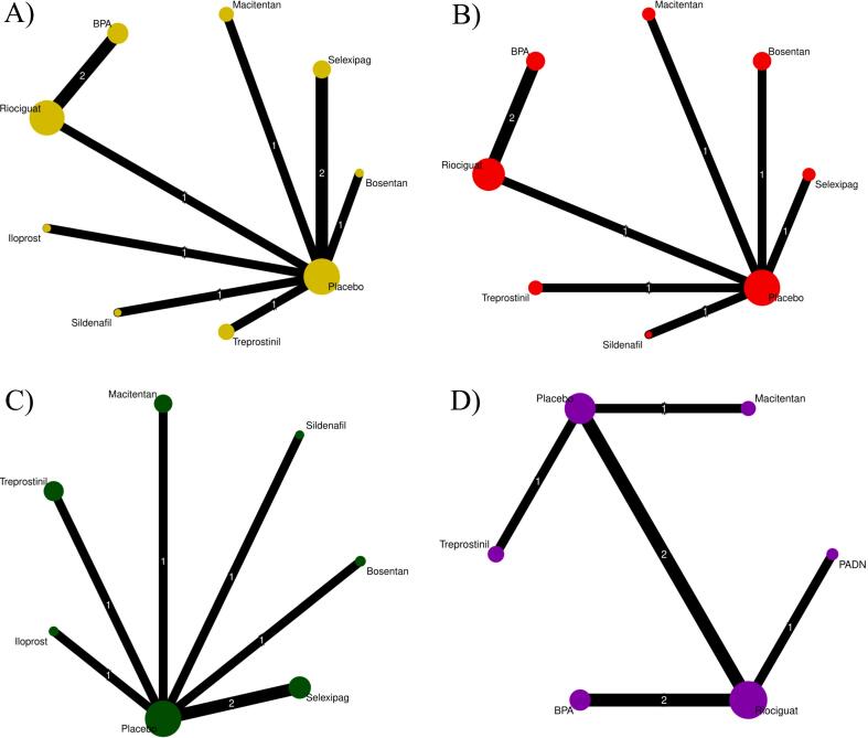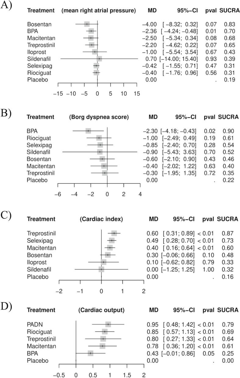 Results: Fourteen RCTs comprising 1047 patients were included in this network meta-analysis. Regarding 6 MWD, PADN (MD=113.59, 95% CI: 53.80; 173.39), BPA (MD=48.84, 95% CI: 27.99; 69.69), riociguat (MD=42.59, 95% CI: 22.01; 63.18), treprostinil (MD=41.60, 95% CI: 17.07; 66.13), and macitentan (MD=34.00, 95% CI: 3.50; 64.50) were favored compared to placebo. In terms of PVR, BPA (MD=-392.19, 95% CI: -571.77; -212.62), treprostinil (MD=-287.20, 95% CI: -475.63; -98.77), PADN (MD=-280.61, 95% CI: -506.69; -54.52), bosentan (MD=-176.00, 95% CI: -340.91; -11.09), and riociguat (MD=-171.61, 95% CI: -298.40; -44.81) displayed statistically significant results.