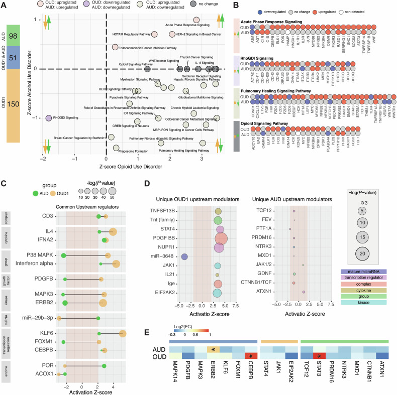 Substance Use Disorders (SUDs) manifest as persistent drug-seeking behavior despite adverse consequences, with Alcohol Use Disorder (AUD) and Opioid Use Disorder (OUD) representing prevalent forms associated with significant mortality rates and economic burdens. The co-occurrence of AUD and OUD is common, necessitating a deeper comprehension of their intricate interactions. While the causal link between these disorders remains elusive, shared genetic factors are hypothesized. Leveraging public datasets, we employed genomic and transcriptomic analyses to explore conserved and distinct molecular pathways within the dorsolateral prefrontal cortex associated with AUD and OUD. Our findings unveil modest transcriptomic overlap at the gene level between the two disorders but substantial convergence on shared biological pathways. Notably, these pathways predominantly involve inflammatory processes, synaptic plasticity, and key intracellular signaling regulators. Integration of transcriptomic data with the latest genome-wide association studies (GWAS) for problematic alcohol use (PAU) and OUD not only corroborated our transcriptomic findings but also confirmed the limited shared heritability between the disorders. Overall, our study indicates that while alcohol and opioids induce diverse transcriptional alterations at the gene level, they converge on select biological pathways, offering promising avenues for novel therapeutic targets aimed at addressing both disorders simultaneously.