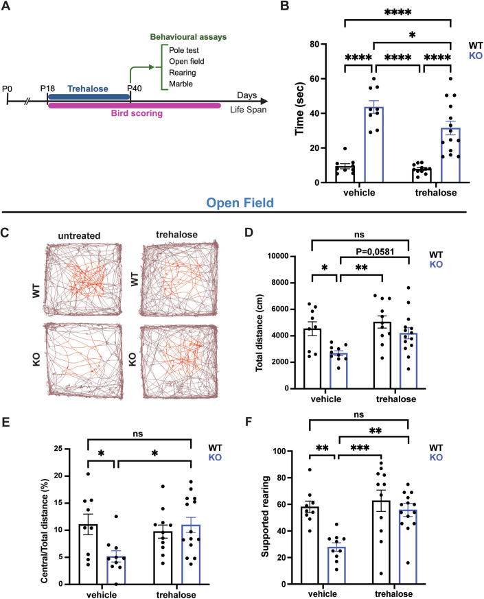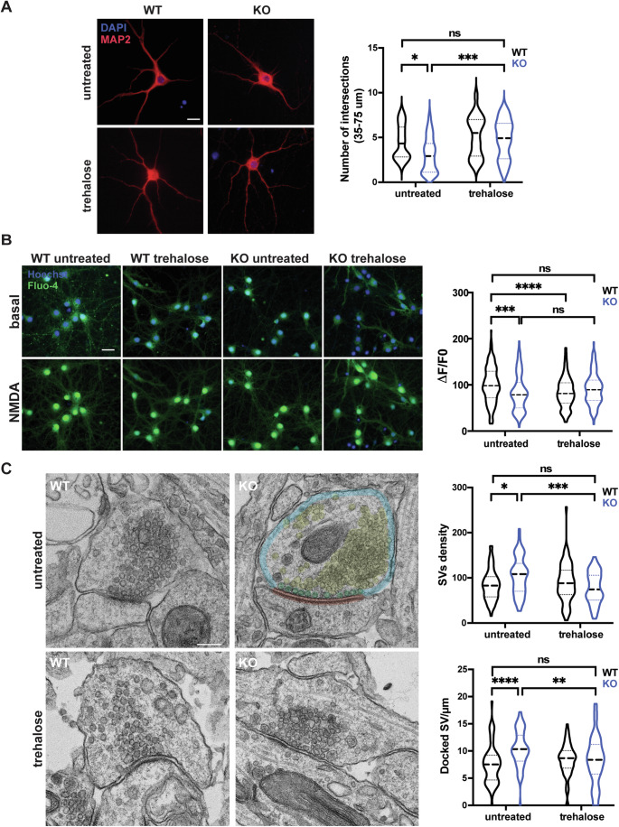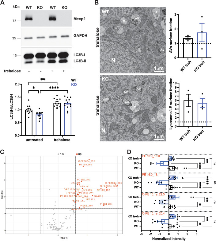 Loss-of-function mutations in MECP2 are associated to Rett syndrome (RTT), a severe neurodevelopmental disease. Mainly working as a transcriptional regulator, MeCP2 absence leads to gene expression perturbations resulting in deficits of synaptic function and neuronal activity. In addition, RTT patients and mouse models suffer from a complex metabolic syndrome, suggesting that related cellular pathways might contribute to neuropathogenesis. Along this line, autophagy is critical in sustaining developing neuron homeostasis by breaking down dysfunctional proteins, lipids, and organelles.Here, we investigated the autophagic pathway in RTT and found reduced content of autophagic vacuoles in Mecp2 knock-out neurons. This correlates with defective lipidation of LC3B, probably caused by a deficiency of the autophagic membrane lipid phosphatidylethanolamine. The administration of the autophagy inducer trehalose recovers LC3B lipidation, autophagosomes content in knock-out neurons, and ameliorates their morphology, neuronal activity and synaptic ultrastructure. Moreover, we provide evidence for attenuation of motor and exploratory impairment in Mecp2 knock-out mice upon trehalose administration. Overall, our findings open new perspectives for neurodevelopmental disorders therapies based on the concept of autophagy modulation.