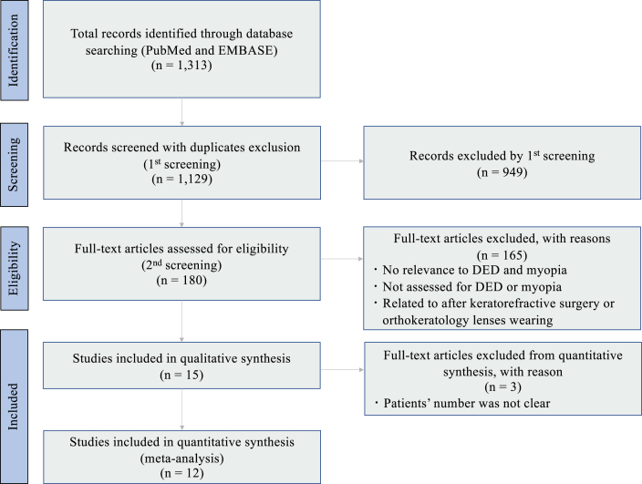 Background/objectives: Dry eye disease (DED) and myopia are common ocular disorders. This systematic review and meta-analysis investigated the association between DED and myopia.