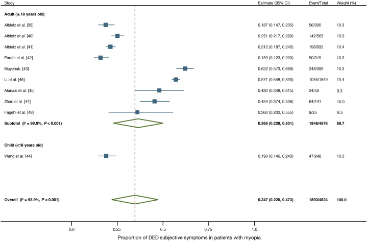 Results: Of the 1,313 studies identified, 15 studies on DED and myopia were included. The meta-analysis revealed that the overall prevalence of subjective DED symptoms in the myopia population was 45.1 % (95 % confidence interval: 0.287-0.616). There was a significant association between DED and myopia. The myopia population had higher Ocular Surface Disease Index scores and shorter tear film breakup times than the non-myopia population. Additionally, the meta-regression analysis showed that spherical equivalent was significantly associated with the prevalence of DED symptoms in adults with myopia.