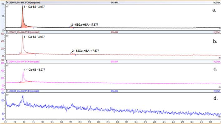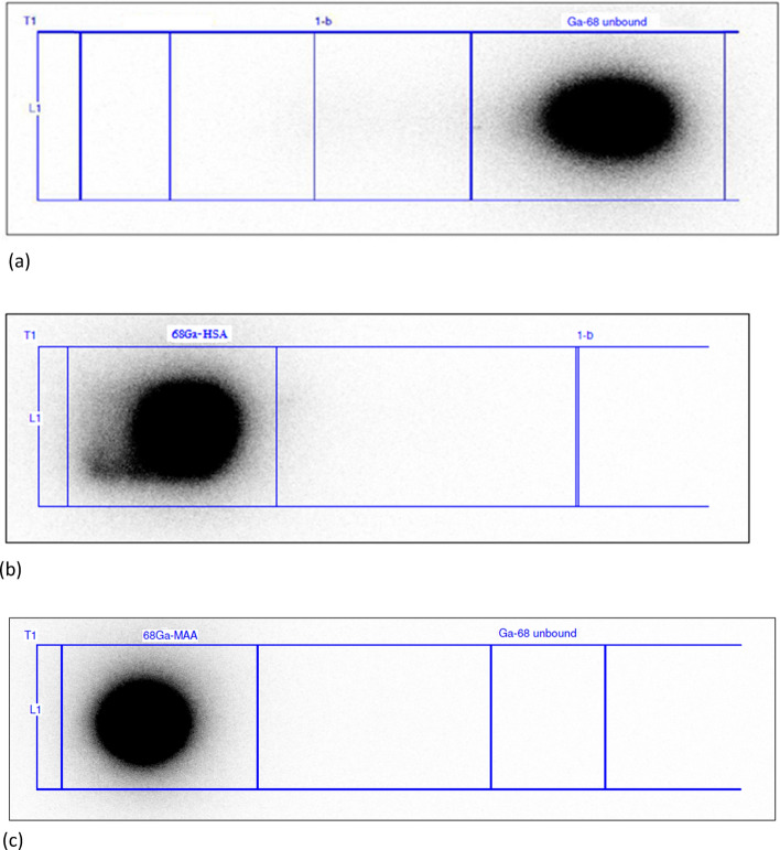 Background: Technetium-99 m-labelled macroaggregated human serum albumin ([99mTc]Tc-MAA) is commonly used for lung perfusion scintigraphy. The European Pharmacopoeia (Eu.Ph.) specifies thin-layer chromatography (TLC) as the only method to assess its radiochemical purity (RCP). Similarly, TLC is the sole method reported in the literature to evaluate the RCP of Gallium-68-labelled MAA [68 Ga]Ga-MAA, recently introduced for lung perfusion PET/CT imaging. Since [68 Ga]Ga-MAA is prepared from commercial kits originally designed for the preparation of [99mTc]Tc-MAA, it is essential to optimize and validate the preparation methods for [68 Ga]Ga-MAA.