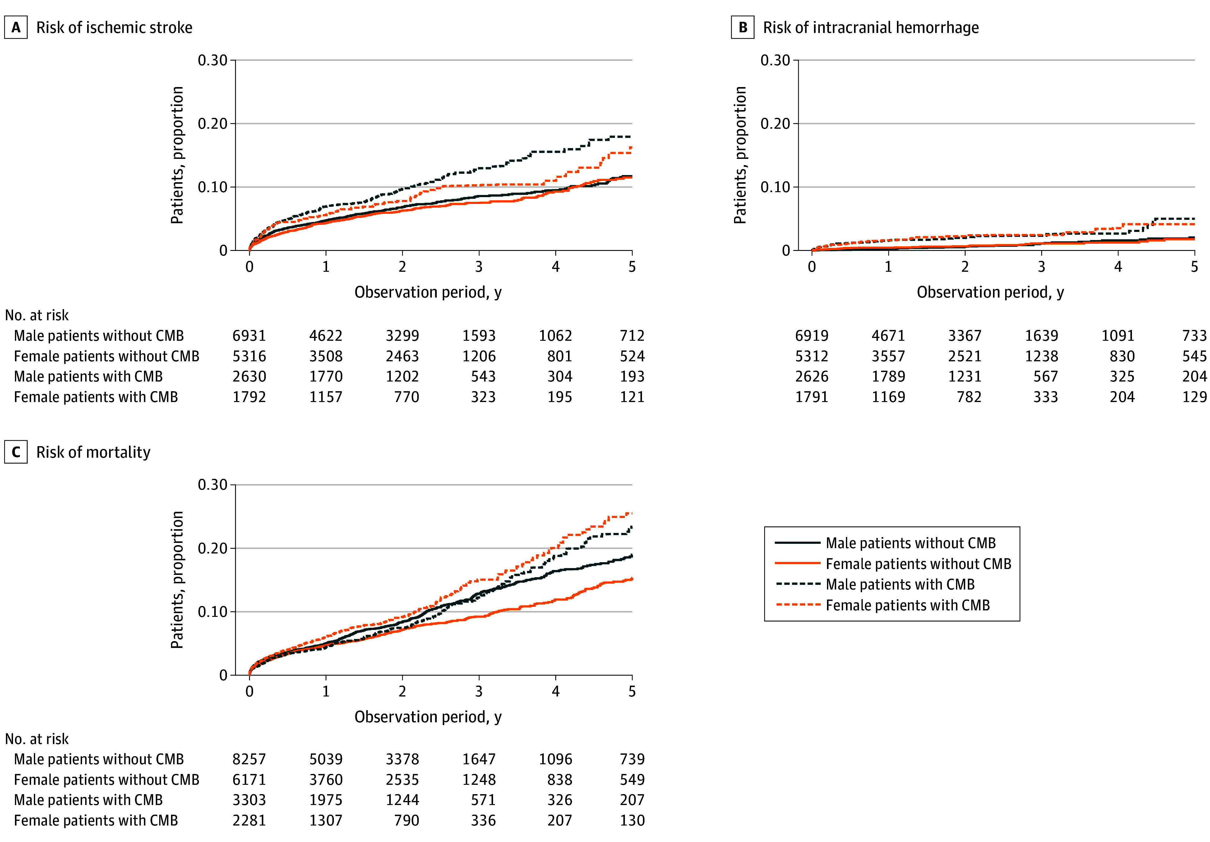 Results: A total of 20 314 patients (mean [SD] age, 70.1 [12.7] years; 11 721 [57.7%] male) were included, of whom 5649 (27.8%) had CMB. CMB were more frequent in male patients, and this was consistent throughout different age groups, locations, and in multivariable models (female vs male adjusted odds ratio [aOR], 0.86; 95% CI, 0.80-0.92; P < .001). Female patients had fewer lacunes (aOR, 0.82; 95% CI, 0.74-0.90; P < .001) but a higher prevalence of severe white matter hyperintensities (aOR, 1.10; 95% CI, 1.01-1.20; P = .04) compared with male patients. A total of 2419 patients (11.9%) died during a median (IQR) follow-up of 1.4 (0.7-2.5) years. CMB presence was associated with a higher risk of mortality in female patients (hazard ratio, 1.15; 95% CI, 1.02-1.31), but not male patients (hazard ratio, 0.95; 95% CI, 0.84-1.07) (P for interaction = .01). A total of 1113 patients (5.5%) had recurrent ischemic stroke, and 189 patients (0.9%) had recurrent intracranial hemorrhage, with no sex differences.