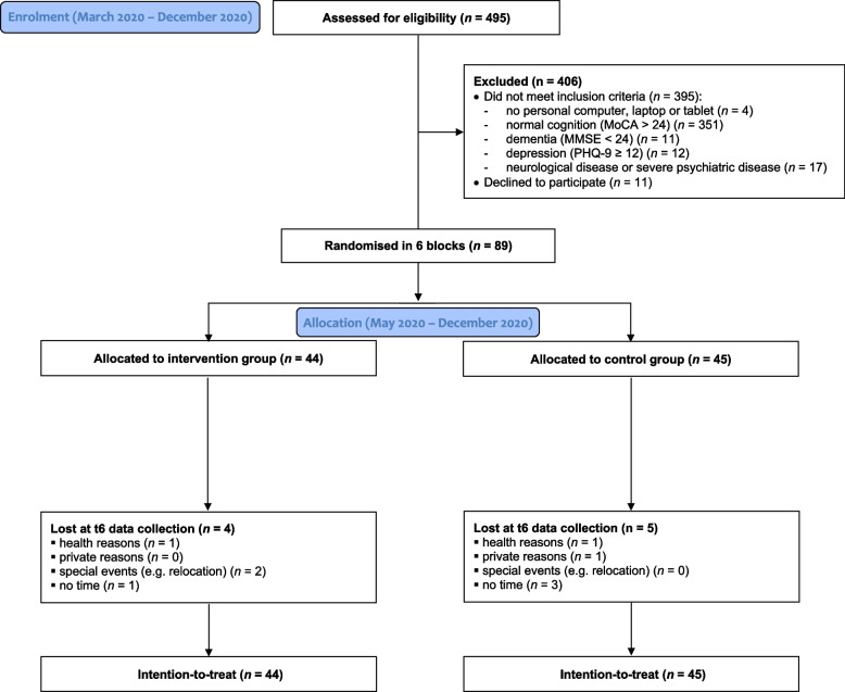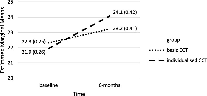 Methods: We developed one individualised CCT (iCCT) with ML and one basic CCT (bCCT) for an active control group (CG). The study aimed to determine whether iCCT in the intervention group (IG) resulted in significantly greater enhancements in overall cognitive functioning for individuals with MCI (age 60+) compared with bCCT in the CG across a 6-month period. This double-blind randomised controlled study was conducted entirely virtually. The 89 participants were community-dwelling people with a psychometric diagnosis of MCI living in Germany. The iCCT stimulates various cognitive functions, especially working memory, visuo-constructional reasoning, and decision-making. The bCCT includes fewer and simpler tasks. Both CCTs were used at home. At baseline and after 6 months, we assessed cognitive functioning with the Montreal Cognitive Assessment (MoCA). A mixed-model ANCOVA was conducted as the main analysis.