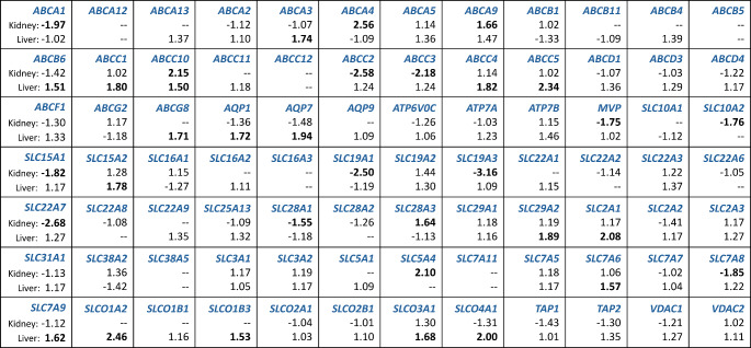 Methods: Human liver and kidney samples were collected post-mortem from 32 to 28 individuals, respectively, which were divided into the control group (lean subjects; 18.5 ≤ BMI < 25 kg/m2) and the study group (overweight/obese subjects; BMI ≥ 25 kg/m2). Real-time quantitative PCR was performed for the analysis of 84 drug transporters.
