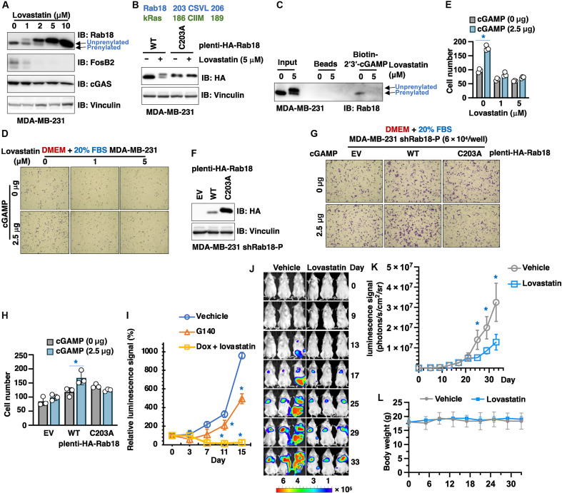 c-di-GAMP was first identified in bacteria to promote colonization, while mammalian 2'3'-cGAMP is synthesized by cGAS to activate STING for innate immune stimulation. However, 2'3'-cGAMP function beyond innate immunity remains elusive. Here, we report that 2'3'-cGAMP promotes cell migration independent of innate immunity. 2'3'-cGAMP interactome analysis identifies the small GTPase Rab18 as a 2'3'-cGAMP binding partner and effector in cell migration control. Mechanistically, 2'3'-cGAMP binds Rab18 to facilitate GTP loading and subsequent Rab18 activation, which further promotes FosB transcription in facilitating cell migration. Induced synthesis of endogenous 2'3'-cGAMP by intrabreast tumor bacterium S. aureus infection or low-dose doxorubicin treatment facilitates cell migration depending on the cGAS/cGAMP/Rab18/FosB signaling. We find that lovastatin induces Rab18 deprenylation that abolishes 2'3'-cGAMP recognition therefore suppressing cell migration. Together, our study reveals a previously unidentified 2'3'-cGAMP function in cell migration control via the 2'3'-cGAMP/Rab18/FosB signaling that provides additional insights into clinical applications of 2'3'-cGAMP.