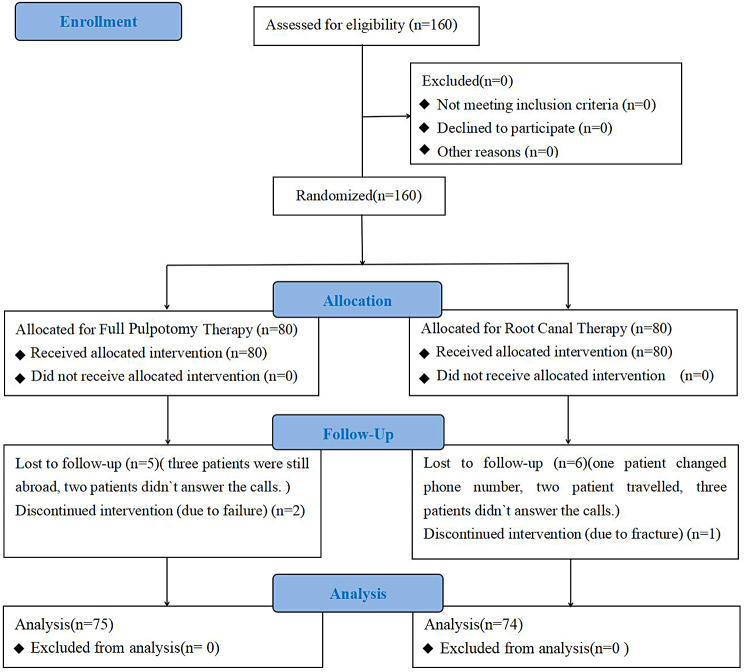 Methods: A total of 160 mature molar teeth with IP were randomly divided into two treatment groups. The FP group (test group) was treated with FP using iRoot BP Plus by an endodontist, the RCT group (control group) was treated with RCT using iRoot SP as sealer by the same endodontist. Pain was recorded preoperatively and daily until day 7 postoperatively. The treatment time and cost were recorded. Clinical and radiographic assessments were collected, and pulp sensibility tests were done by electric pulp test (EPT) at 3-, 6-, 12- month postoperatively. Data were analyzed through chi-square test, Mann-Whitney U test, Fisher exact and independent t test.