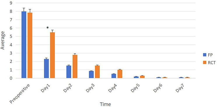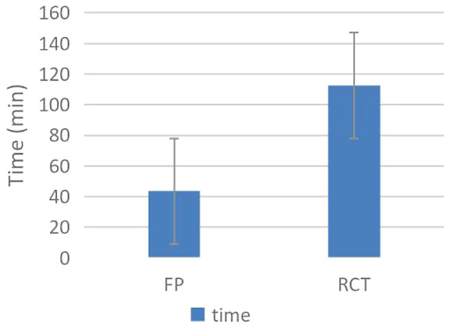 Results: FP and RCT had comparable success rates (Clinical, 97.3% vs. 98.6%; radiographic, 93.3% vs. 94.6%) (P > 0.05). Pain levels decreased over time from day 1 to day 7 postoperative in both groups, and the FP group had larger reductions in pain intensity than RCT at day 1 (P < 0.05). In the FP group, there were 5, 3 and 3 unresponsive teeth with EPT at 3-, 6- and 12- month follow-ups, respectively. The treatment time and cost in the FP group were significantly lower than in the RCT group (P < 0.05).